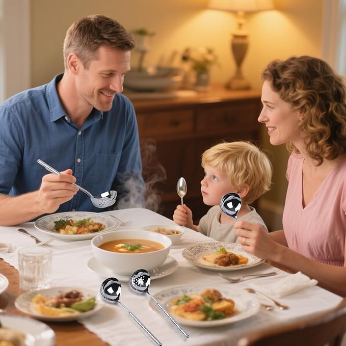 - Ergonomic Round Handle for Comfortable Grip – Designed to reduce hand fatigue during extended use, whether serving soups, stews, gravies, or hot pot. The 9.4-inch length and balanced weight (0.40 lbs) provide optimal control.