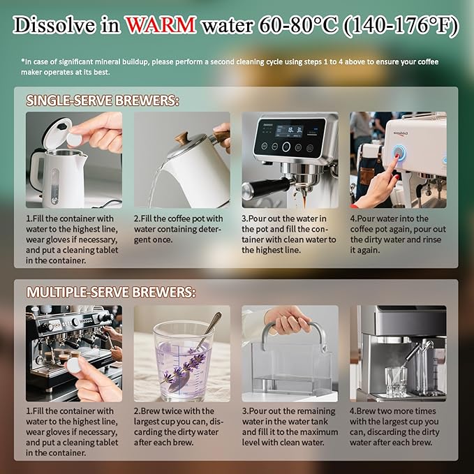 - MAINTENANCE SCHEDULE: Regular use helps maintain optimal coffee taste and machine performance by removing built-up residue. Effortless Cleaning: Just drop a tablet into the water reservoir, run a brew cycle, and rinse. No scrubbing or harsh chemicals required—perfect for busy coffee enthusiasts