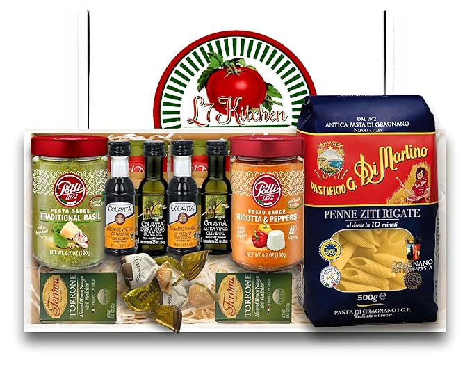 - PGI Certified Bronze-Cut Gragnano Penne, Traditional Basil Pesto, Ricotta & Peppers Pesto, Seasonings and After Dinner Sweets