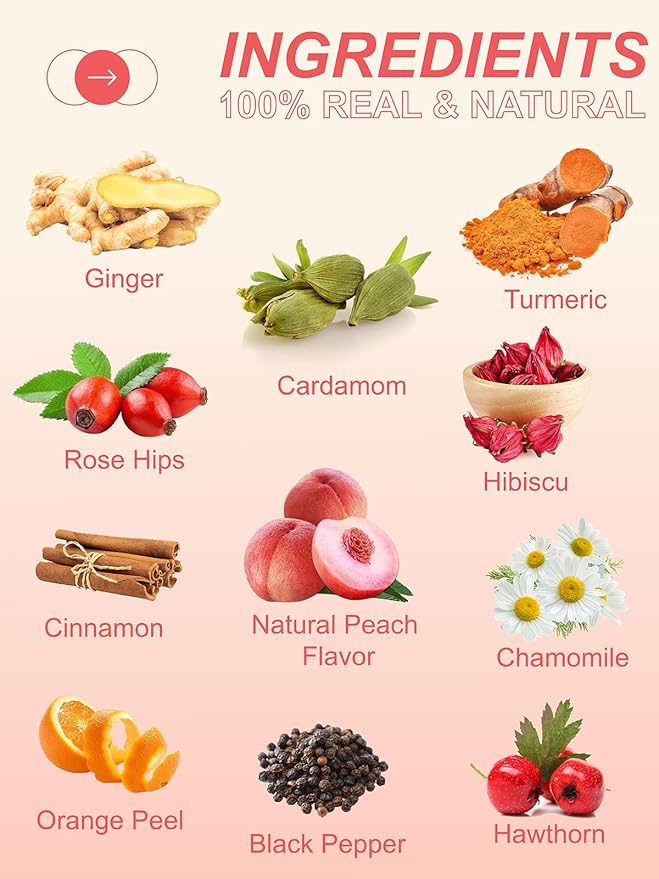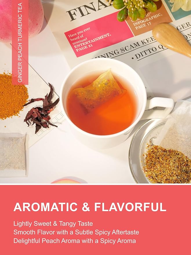 - [FLAVORFUL & AROMATIC] - Ginger Peach Turmeric herbal tea is a delicate blend of warm turmeric & ginger, fruity rosehips, tart hibiscus, soothing chamomile, and sweet cinnamon, it has fruity and sweet flavor with a hint of floral or herbal notes, creating a refreshing and soothing beverage.