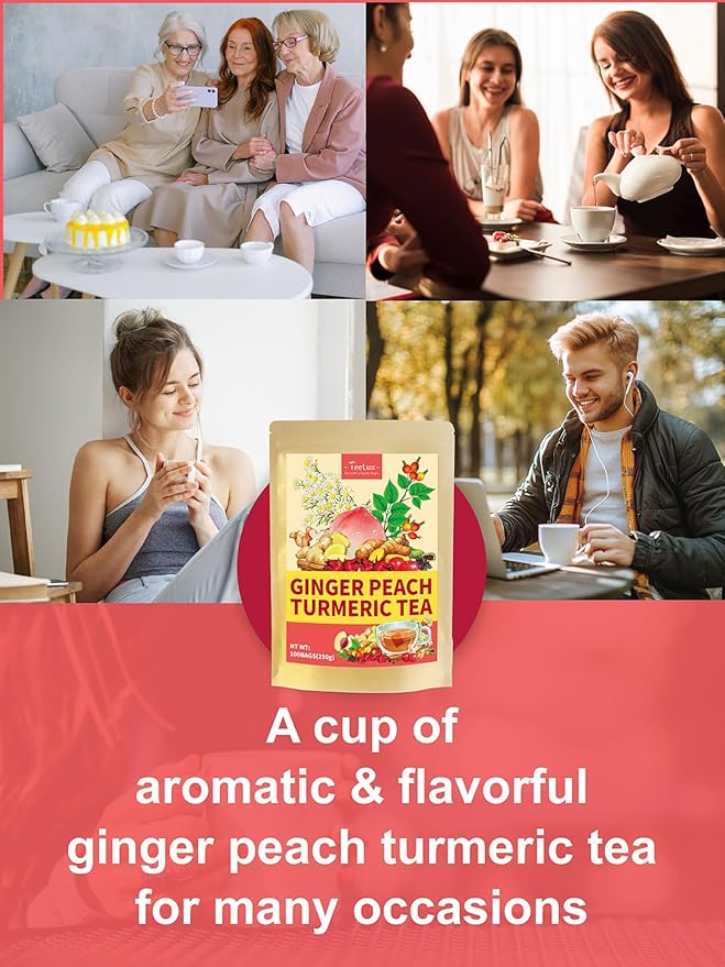 - [PREMIUM TURMERIC GINGER PEACH TEA] - We strictly select premium ingredients, hand-picked, carefully sun-dried, and blended to bring you natural and fresh herbal tea. The Turmeric Ginger Peach Tea is delicious whether enjoyed hot or iced, making it a versatile choice for any time of the day.