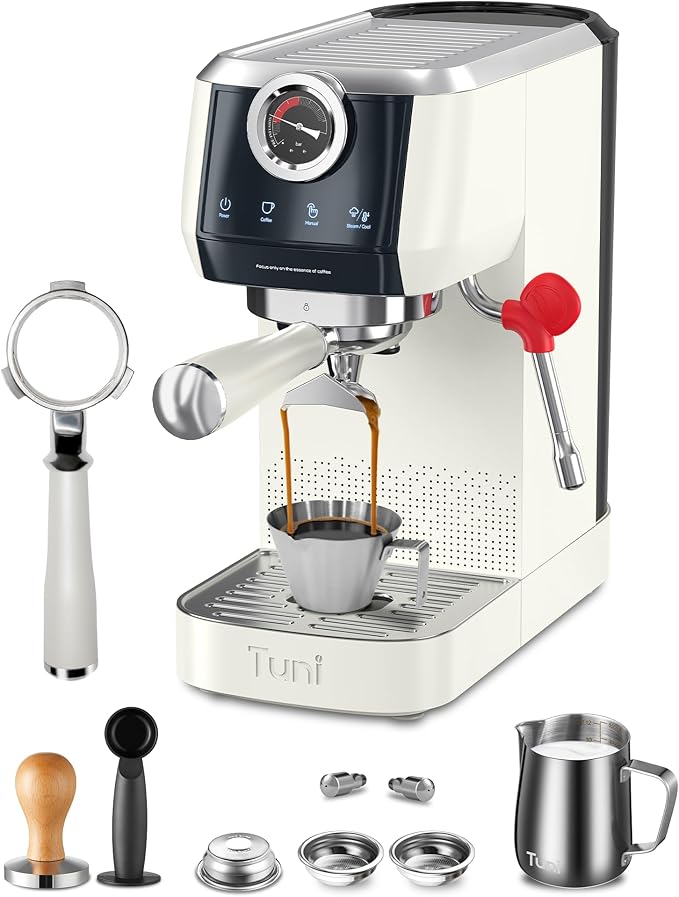 - [Dual Heating System & 20-Bar High Pressure] - The Tuni semi-automatic espresso machine heats up in just 30 seconds and extracts rich crema, letting you enjoy a delicious espresso quickly. It features an original Italian 20-bar ULKA water pump and a built-in visual pressure gauge, with precise temperature control via PID + NTC to ensure full extraction of flavor and oils, resulting in a rich and aromatic espresso.