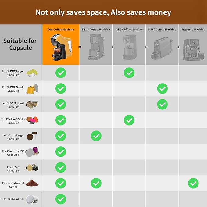 - 【5in1 Espresso Machine】The Kotlie Espresso Machine is with 19Bar pressure and 1400W fast-heating boiler, it’s easy to brew a rich cup of CREMA Espresso within 30 seconds. KOTLIE EM-308A Espresso coffee maker’pods( already in package) are for D*olce G*usto Capsules/Nes*presso Original Capsules/K-Cup Capsules/Ground Coffee and ESE(44mm) Coffee. With One coffee machine, you can enjoy different taste
