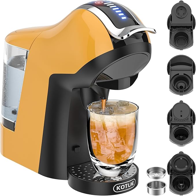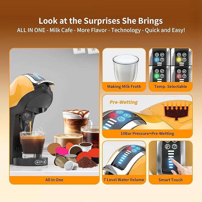 KOTLIE Espresso 5in1 Single Serve Coffee Maker, 19Bar Cappuccino&Latte Maker, Cold&Hot Brewing Coffee Machine for K*cup/NES*presso Original/D*olce G*usto/Ground Coffee/44mm ESE(Yellow)