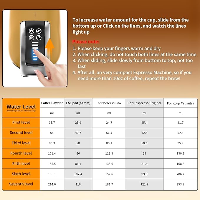 - 【Smart Technology】 This EM-308A KOTLIE Coffee Maker has a built-in smart app that can recognize different pods and initiate different brewing programs to maximize the taste and flavor of your coffee. It is also equipped with a smart touch panel, you can touch the panel buttons to select functions or slide the 7-level cup volume button to choose the amount of coffee liquid