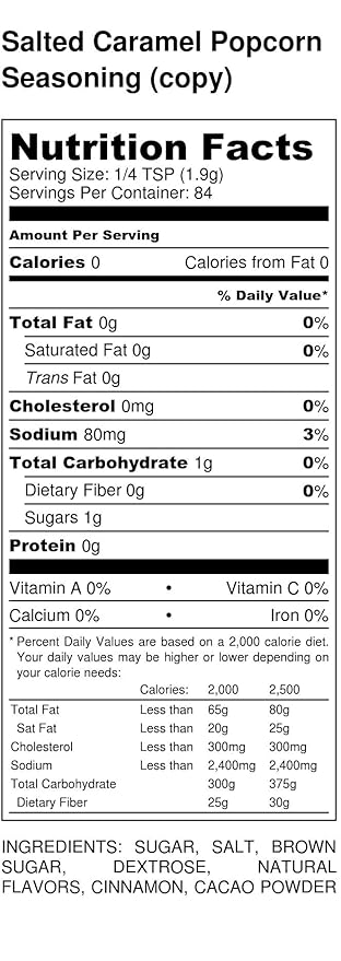 - 🍿 Salted Caramel is perfect For: Lightly buttered popcorn or kettle-popped corn Mixed into granola or drizzled on caramel corn clusters Baked into cookies or sprinkled on top of cupcakes Dust over lattes, hot cocoa, or whipped cream for a sweet topping