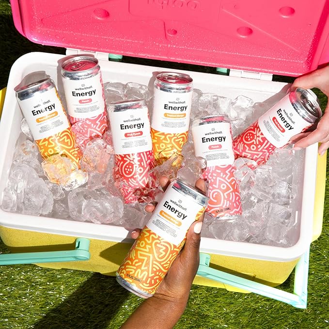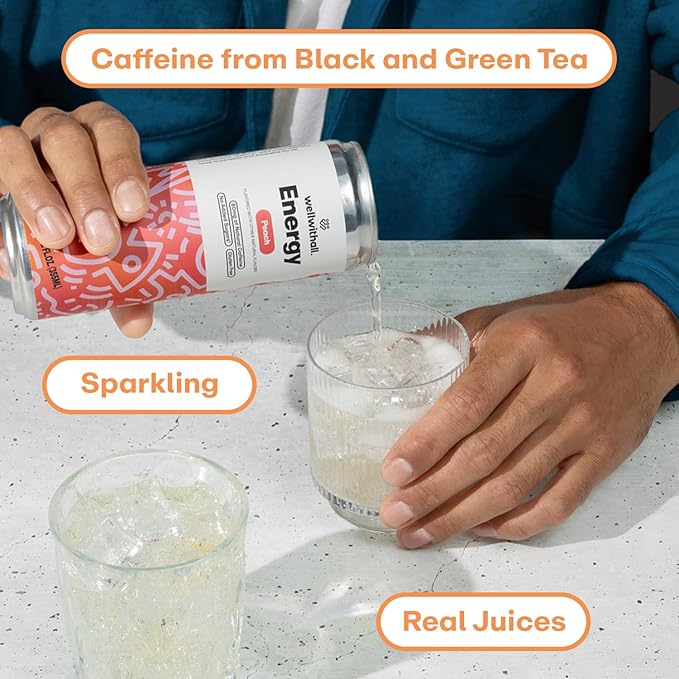 WellWithAll Peach Energy Drink ??Caffeine from Tea ??With Vitamin C ??Lightly Sparkling Beverage ??Fruit & Veggie Juice Blend ??12 Oz (Pack of 12)