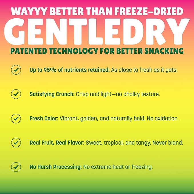 - DRIED DIFFERENT: We’re not freeze dried fruit, and we’re proud of it. Our GentleDry method skips the harsh stuff—no freezing, frying, or flavor-zapping heat. Just vibrant color, fresh pineapple flavor, and crunch that actually satisfies. Think fresh pineapple energy with a pantry-friendly shelf life.