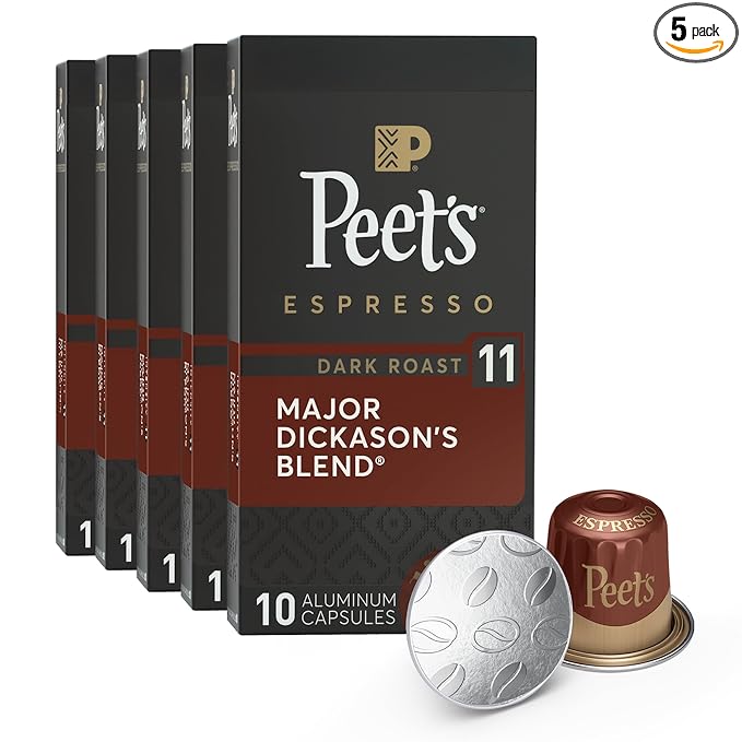 - Contains five (5) Boxes of 10 Peet's Major Dickason's - Intensity 11 Dark Roast Coffee Single Cup Espresso Capsules (50 Espresso Capsules Total)