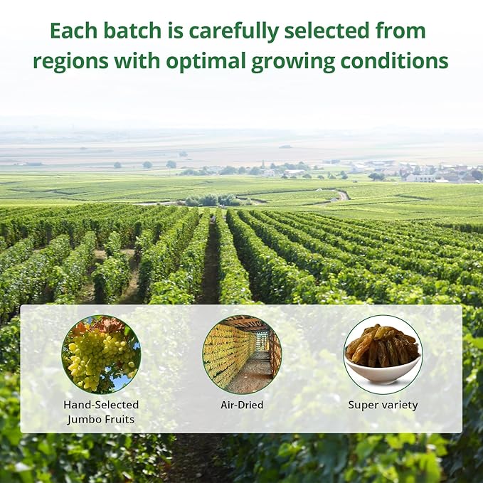 - Pure and Ready-to-Eat: Only 5% of the finest seasonal grapes are selected, late harvesting for enhanced sweetness, 30-day natural air-drying while still on the vine, triple washing, and steam sterilization—no added sugar, no oil, no sulfur, and no artificial preservatives or colors