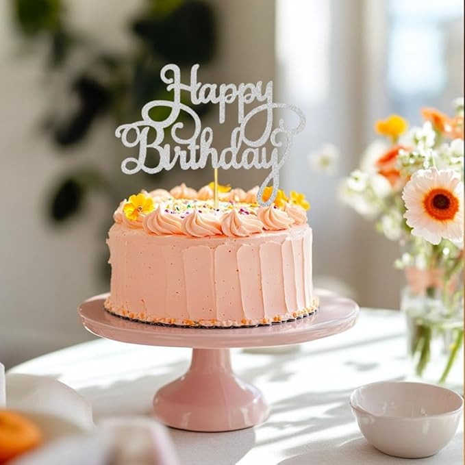 1 PCS Happy Birthday Cake Topper Glitter Silver Celebration Cake Picks Happy Birthday Decorations for Anniversary Birthday Party Decorations