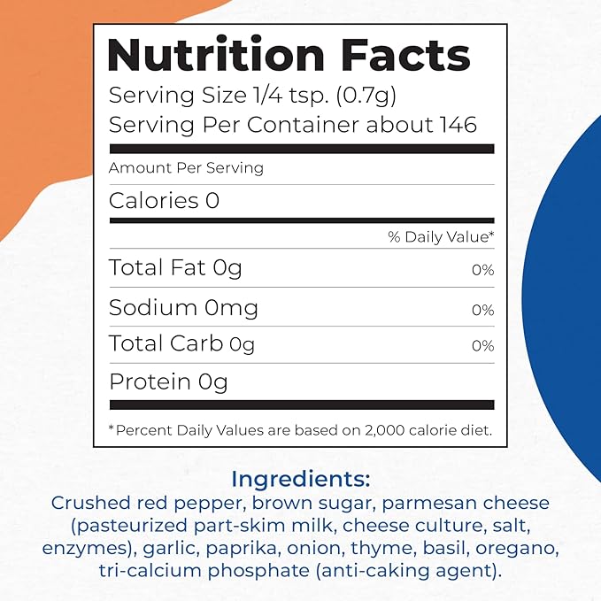 - Quality Ingredients: Made with real Parmesan cheese, crushed red pepper, garlic, onion, thyme, basil, oregano & Brown Sugar, this seasoning blend brings together natural ingredients with no added salt, MSG, or preservatives - giving you pure flavors in every sprinkle; Crafted with high-quality herbs and spices, this blend ensures that every meal you prepare is both delicious and free from artificial additives, making it a healthier choice for you and your family
