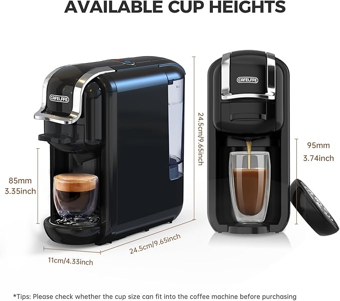 - Tips: This capsule coffee machine adopts a compact design and does not take up too much space. It can accommodate coffee cups up to 3.3 inches (with drip tray) - 3.7 inches high (without drip tray). The machine size is 4.3 inches * 9.7 inches * 9.7 inches. Please read the size information carefully before purchasing to avoid misunderstanding.