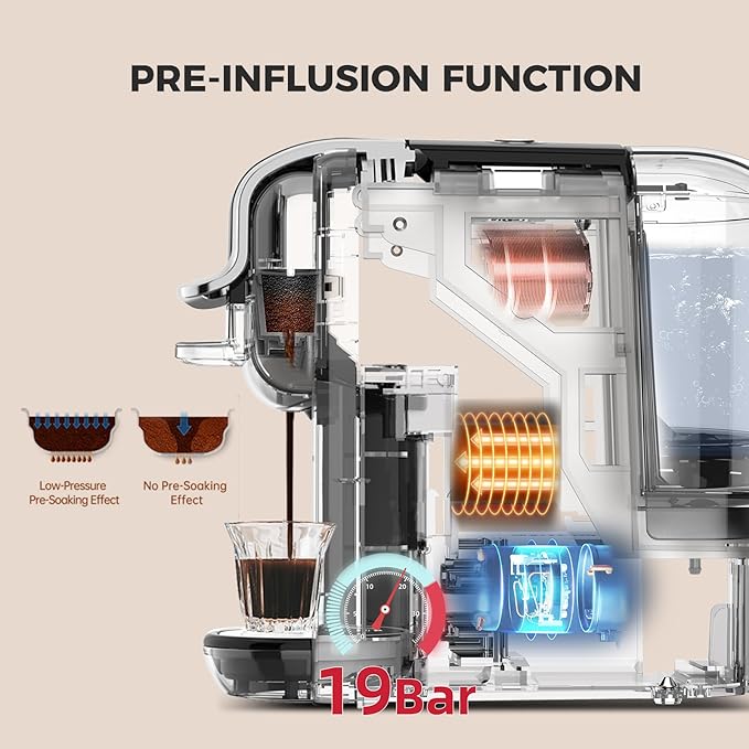- [ Pre-Infusion Tech ] Advanced pre-infusion technology gently wets coffee grounds before extraction, reducing channeling for balanced flavor. Perfect for extracting nuanced notes from capsules or ground coffee