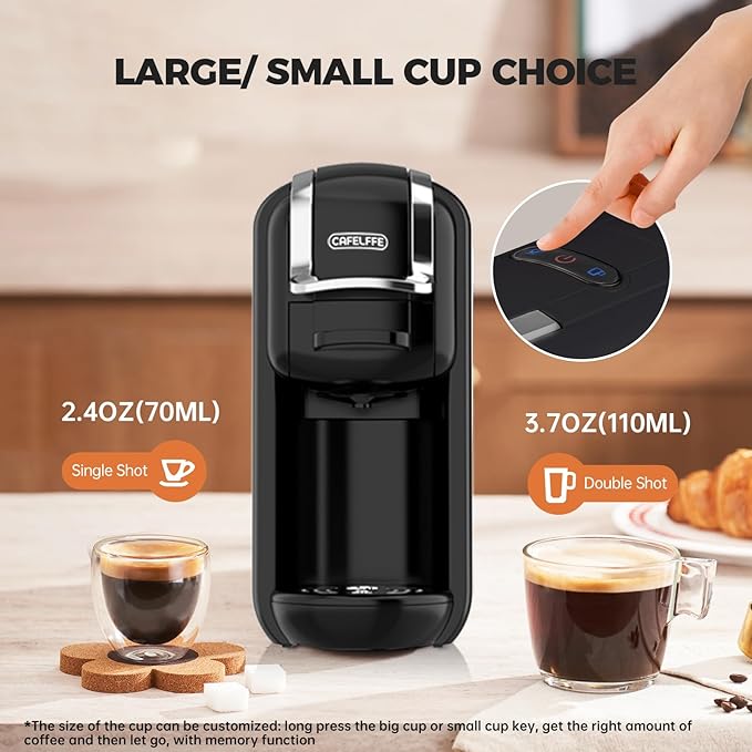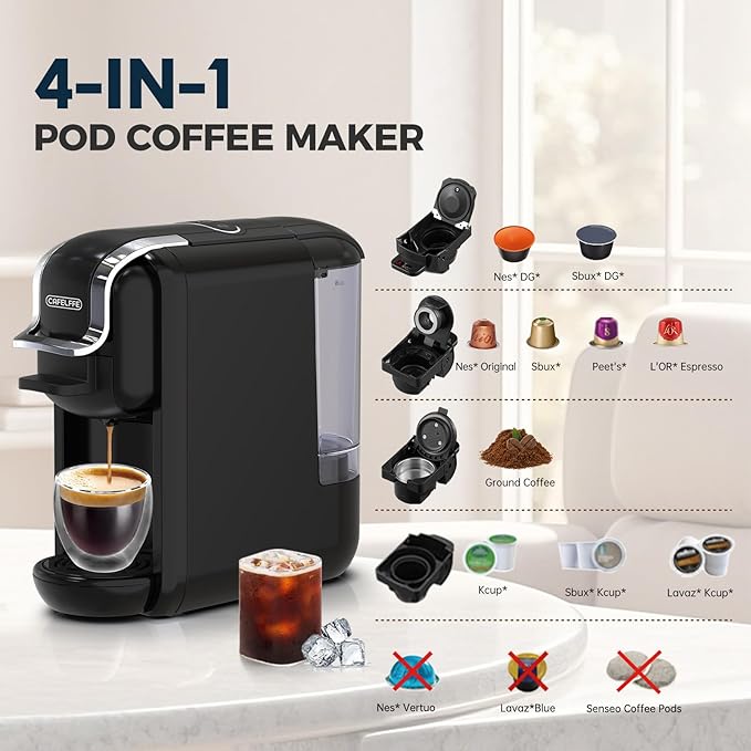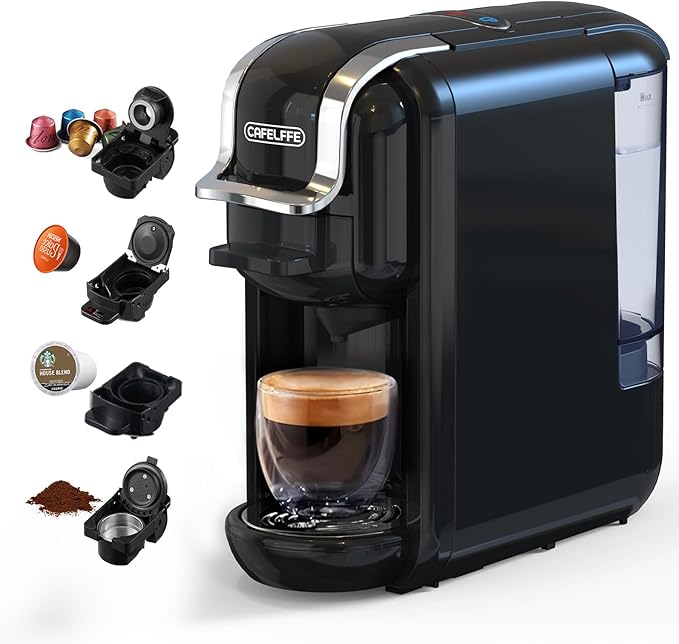 - [ 4 in 1 Coffee Machine ] Cafelffe MK-603: A versatile 4-in-1 coffee maker espresso machine combo designed for Nespress Original,DG capsules,K pods and ground coffee. Perfect for home or small office use, this single-serve machine delivers barista-quality espresso, cappuccino, latte, cold brew, and drip-style coffee with unmatched flexibility.