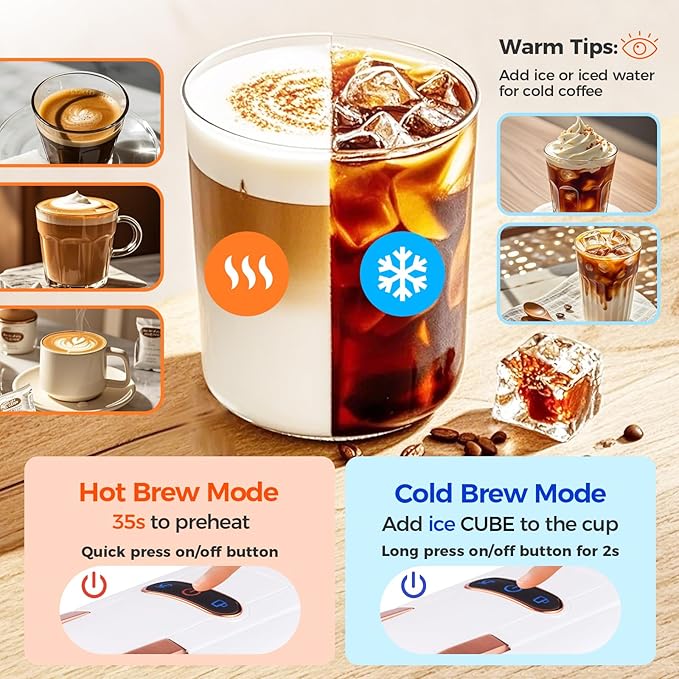 - [ Hot and Cold Brew ] Enjoy café-style hot or cold coffee in seconds! The 19 bar high-pressure system ensures optimal extraction for rich espresso, while the cold brew function creates smooth, refreshing iced coffee.