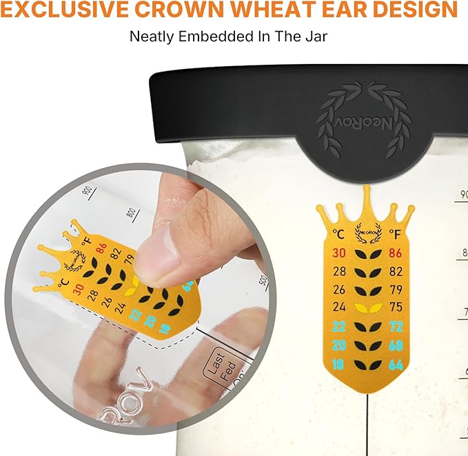 - 【Multipurpose Sour Dough Starter Jars】:Maintain The Perfect Environment For Your Sourdough Starter With Our Thoughtful Design. The Jar Features Clear Markings For Capacity, Weight, And Feeding Levels. A Thermometer Strip Provides Real-Time Temperature Readings, Ensuring Ideal Fermentation Conditions. The Elastic Tracker Band Is Labeled With Days Of The Week And Time Markers So You Can Easily Track When You Last Fed Your Starter And Monitor Its Growth