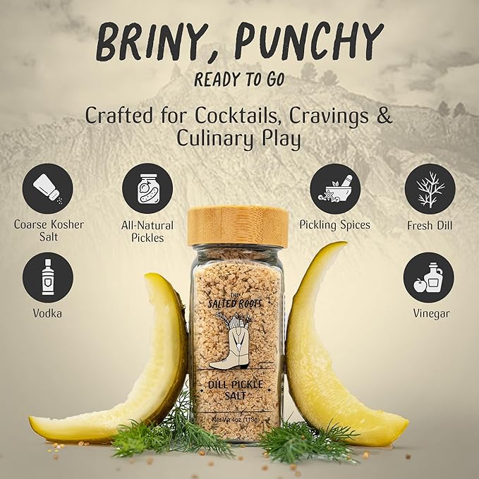 The Salted Roots - Dill Pickle Salt - Vodka-Infused with Fresh Dill, Vinegar & Pickling Spices - Tangy Gourmet Seasoning for Bloody Marys, Burgers, Popcorn & Fries - 4oz Jar