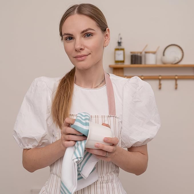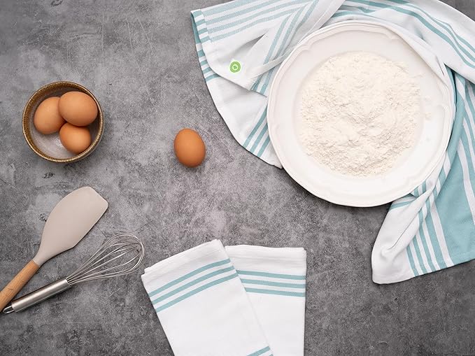 - Aqua and White Kitchen Towels - Discover new levels of comfort that elevate your kitchen experience with 100% cotton kitchen dish towels. Whether you're whisking, chopping, or simply tidying up after a meal, our cotton tea towels pamper your hands in a cocoon of softness, making every culinary endeavor a pleasure