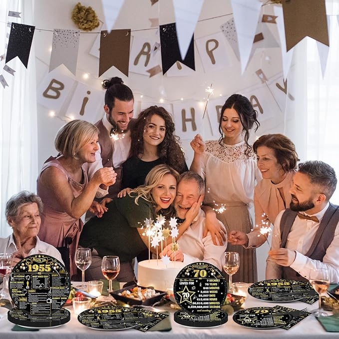 - Back in 1955 Party Tableware Set: Celebrate 70 years with fun facts from music, sports, and movies since 1955, plus creative ways to honor the decades. Black gold 70 year old designs spark nostalgia and add warmth and charm to your birthday celebration.