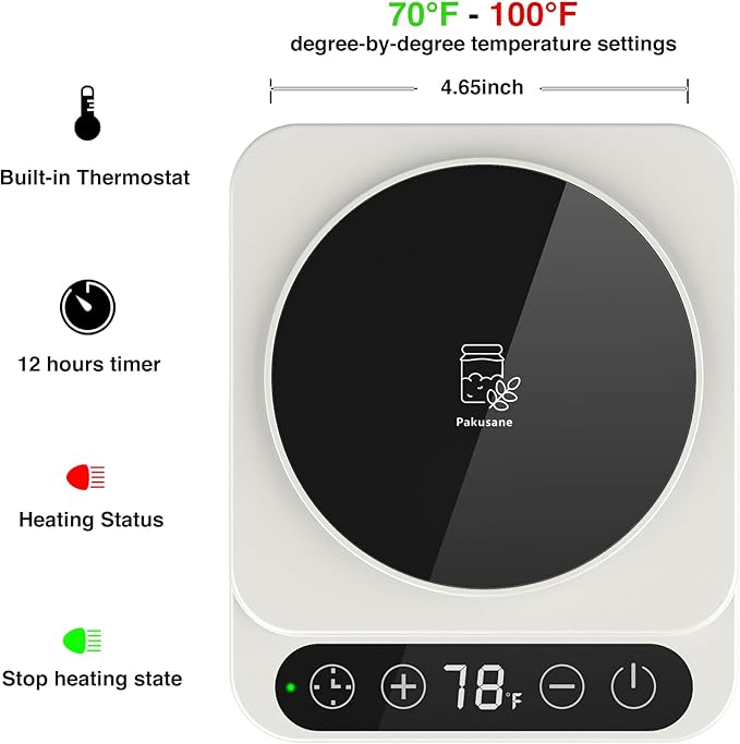 - Precision is key! Our device offers degree-by-degree temperature settings from 70-100°F, with a built-in sensor for real-time monitoring. The auto-warming on/off switch and 12-hour timer function allow you to easily adapt to changes in ambient temperature and jar thickness, ensuring optimal results every time.