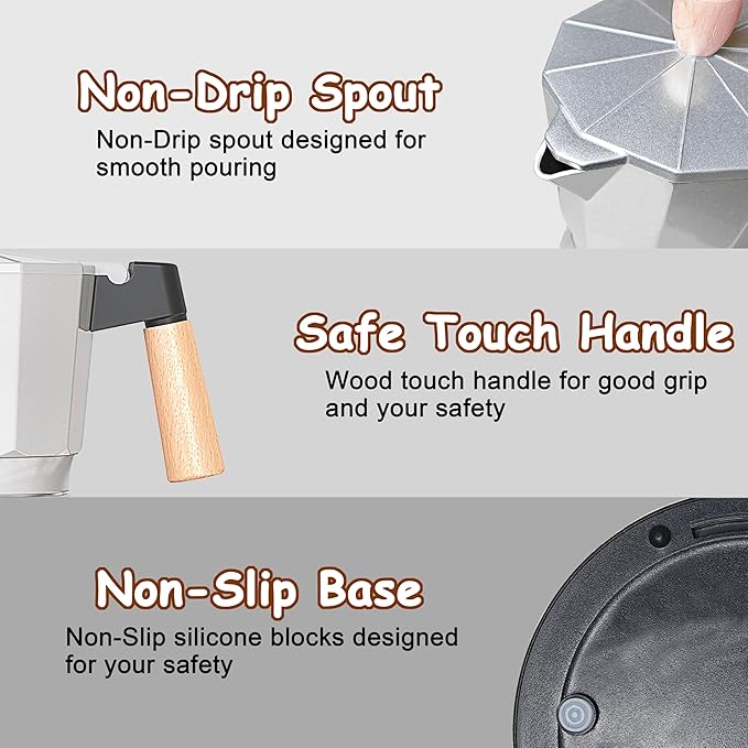 - 【Easy & Fast Operation】Without complicated operation and heat stove, just fill the boiler with fresh water until reaching the safety valve(visible inside the boiler), next fill the funnel filter with good quality, medium-ground coffee, then tighten the coffee maker and rest it on the base, finally press the switch wait a few minutes and you can enjoy an authentic Italian Moka coffee.