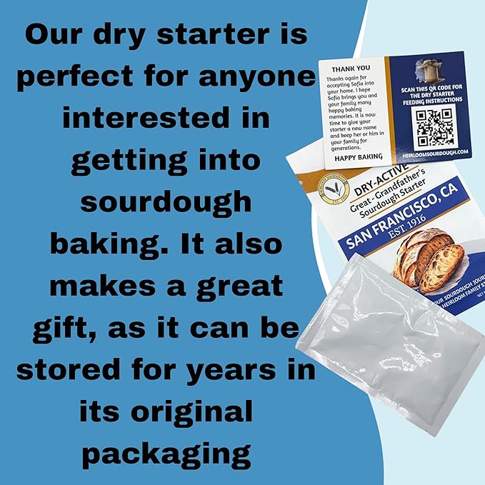 - You will receive our dry-active heirloom starter “Sofia” along with a link on how to feed and care for her.
