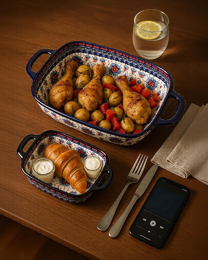 Ceramic Baking Dish Set of 2 ??Decorative Polish Pottery Style Casserole Dishes with Handles, Cute Oven-Safe Lasagna Bakeware Gift Set