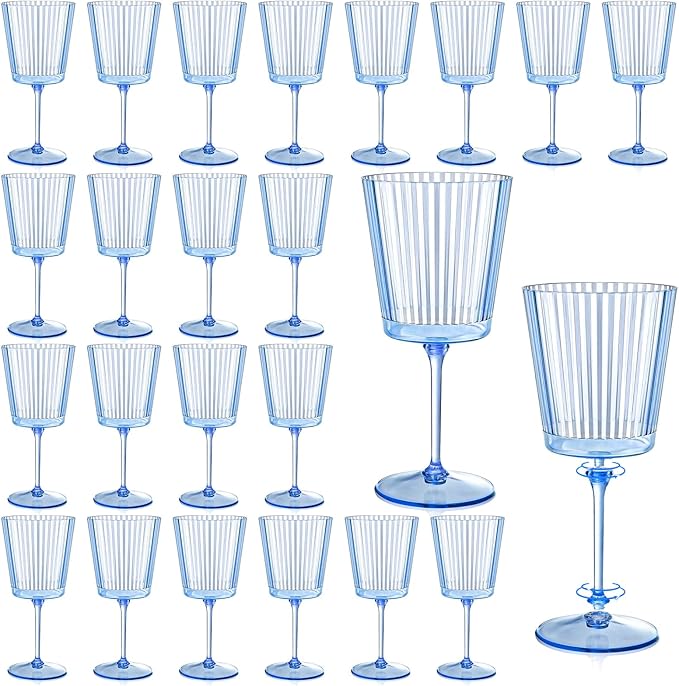 - ·24 Pack Elegant Blue Ribbed Design: These blue ribbed wine glasses bring a soft and sophisticated touch to any occasion. With a set of 24, these glasses are perfect for larger gatherings, ensuring every guest can enjoy their drink in style while adding a coordinated, elegant look to your celebration. The charming blue color, combined with the ribbed design, enhances the look of your stemmed wine glass set and adds elegance to any table setting.