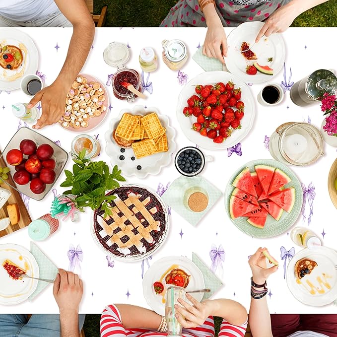 - Have Fun Partying: Made from waterproof plastic, our purple bow party tablecloth is tear-resistant. It also effectively resists spills and stains. Plus, you can celebrate to your heart's content, because cleanup is a breeze. Just roll up the disposable table cover and throw it away, allowing you to focus on creating wonderful memories.