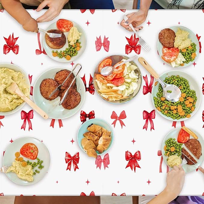 - Enchanting Red Bow Design: Our red bow party tablecloth is adorned with artistic red bows, sweet cherry patterns, and a pure white background, creating a lively and elegant party atmosphere. In addition, add splendor to your celebration with our bright red bow party tablecloth, allowing your guests to enjoy the party and smile with joy.