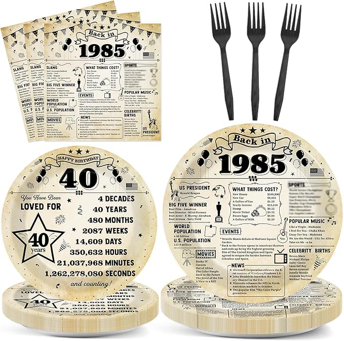 - Package includes: The vintage back in 1985 party tableware set includes 24pcs 23 cm/9 inch 40th birthday party plates, 24pcs 18 cm/7 inch 40 year old party dessert plates, 24pcs 16 cm/6.3 inch napkins, and 24pcs black plastic forks. Each set can serve 24 guests.