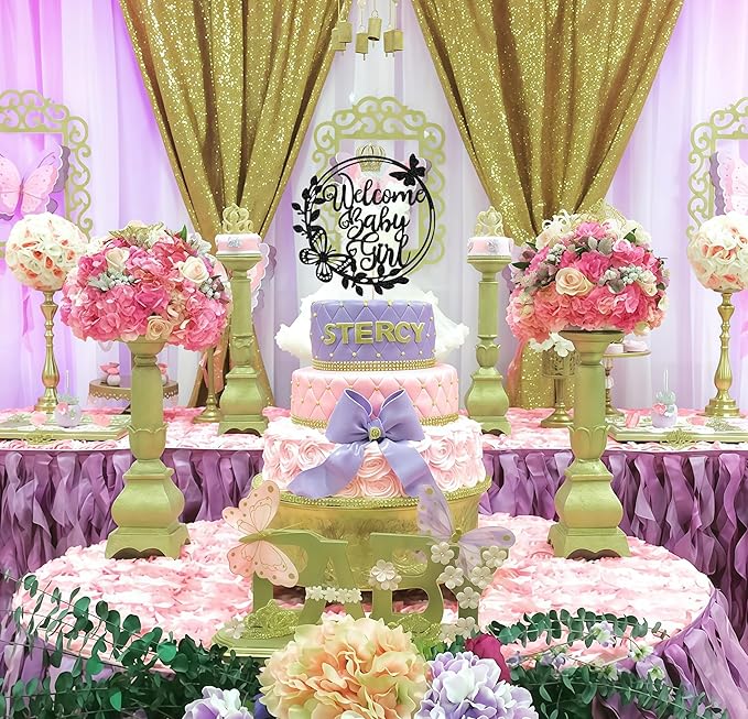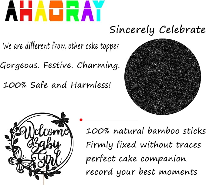 - THE BEST MATERIAL: This Welcome Baby Girl Cake Topper is made of healthy and eco-friendly glitter paper and bamboo sticks, which are harmless to human health, you can decorate it on the cake with confidence. Black glitter paper will shine very brightly in the light and make your cakes look tastier. And this welcome baby girl cake topper is so lightweight that it won't ruin your cake shape