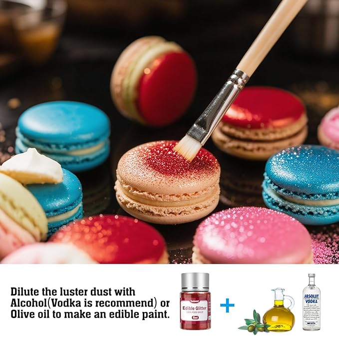 - 【Easy to Use & Versatile】: The edible glitter can simply apply dry with a brush, or mix with alcohol, lemon extract or oil-based flavorings for spray or brush application, or even mix into beverages. These edible luster dust is perfect for decorating frosting, fondant, whipped cream, cocktails, mocktails, champagne, and chocolates with a stunning Red shimmer effect.