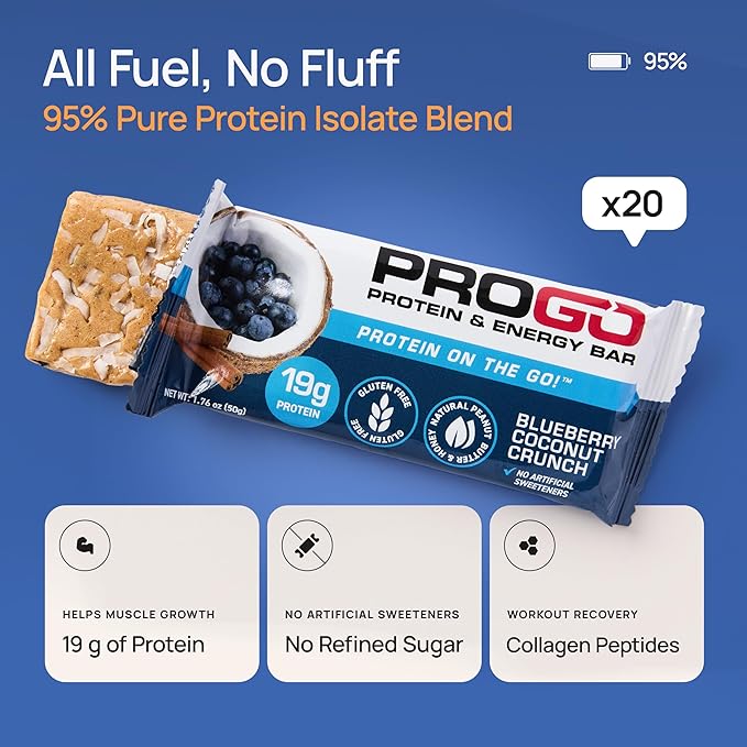 ProGo Protein Bars, Low Sugar, High Protein Snacks (19g) - 95% Pure Isolate for Faster Muscle Growth & Recovery, Low Calorie, Sweetened w/Peanut Butter & Honey (20-Count, Blueberry Coconut)