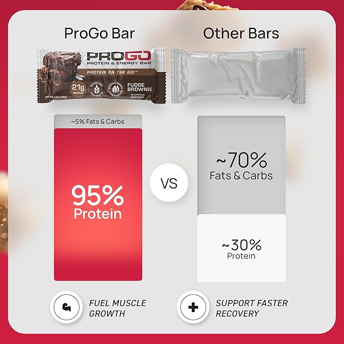 - Clean, 21g High Protein Snacks: ProGo’s 95% pure protein isolate blend powers these energy bars with superior efficiency for muscle growth and repair compared to blends with only 30-80% protein content.