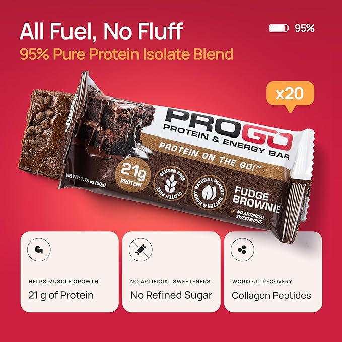 ProGo Protein Bars, Low Sugar, High Protein Snacks (21g) - 95% Pure Isolate for Faster Muscle Growth & Recovery, Low Calorie, Sweetened w/Peanut Butter & Honey (20-Count, Fudge Brownie)