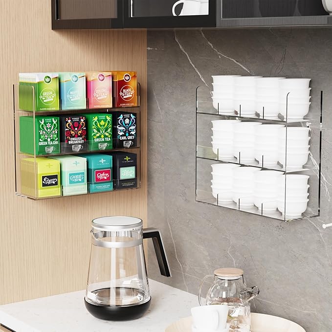 - 【BEAUTIFUL】Laumffon wall mount tea bag rack is a very beautiful tea organizer that perfectly demonstrates the modern, elegant and clean characteristics of acrylic. Because of the transparency of the acrylic, it gives the appearance of not taking up much space when placed on the desk.