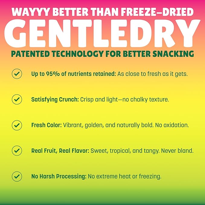 - DRIED DIFFERENT: We’re not freeze dried fruit, and we’re proud of it. Our GentleDry method skips the harsh stuff—no freezing, frying, or flavor-zapping heat. Just vibrant color, fresh pineapple flavor, and crunch that actually satisfies. Think fresh pineapple energy with a pantry-friendly shelf life.