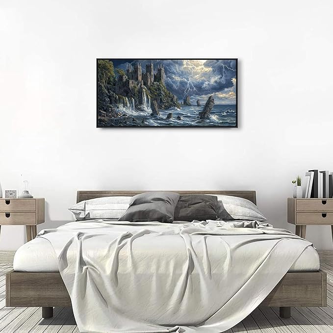 - Farmhouse Framed Wall Art: This wall painting shows an old castle on a cliff, lightning flashes through the cloudy sky, and a waterfall pours down from the cliff into the turbulent sea, The whole scene is full of mystery and magnificence, Landscape pictures is a perfect addition to your living room or bedroom