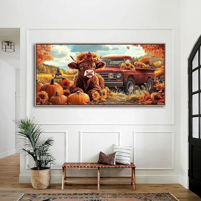 - Charming Autumn AVintage Wall Art: This canvas wall art beautifully captures the essence of fall with a cow adorned in a flower crown, a vintage red truck, and a backdrop of golden foliage, pumpkins, and sunflowers. It brings the warm, cozy vibes of autumn into your home.