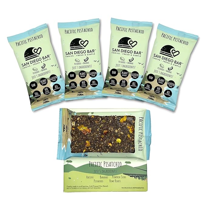 San Diego Bar - Pistachios + Banana | 10g Protein | Raw & Vegan Energy Meal Bars | Gluten & Soy Free | No Added Sugar | Only 6 Whole Food Plant-Based Ingredients | All Natural Clean Pacific Pistachio Breakfast Bar (2.22 Oz Each - 4 Pack)