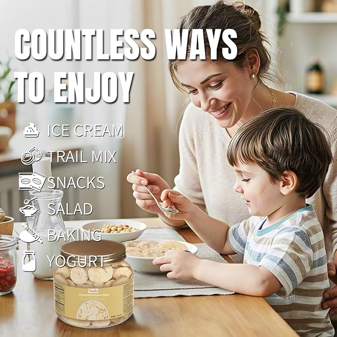 - 🧁Multiple Eating Scenarios: Add these banana chips to baked goods, use them as crispy ingredients for yogurt and cereal, or enjoy them as snacks. They can also be added to milk, milkshakes and smoothies, cakes, cookies, waffles, etc., with a variety of uses.