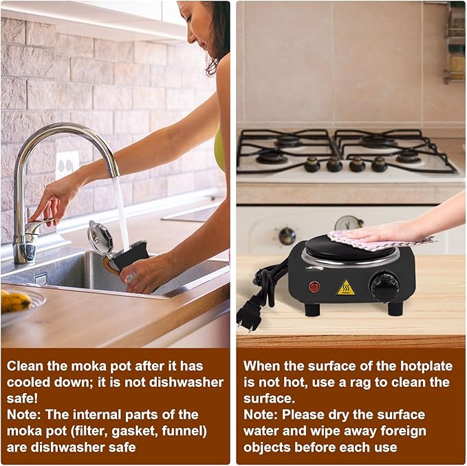- Cleaning Instructions: The top of stovetop espresso maker is removable and the internal parts are dishwasher safe, but we recommend washing the aluminum body as hand washing will keep it shiny and well finished over time. Warm tip: Rinse parts with water and dry before reassembly. After using the stove, please wait for the surface to cool down completely and wipe it with a slightly damp soft cloth. Please note: Do not immerse in water for cleaning, and if liquid spills while making coffee, please turn off the power immediately