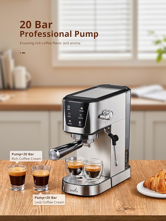 UDI Espresso Machines with LED Touch screen, 20 Bar Espresso Coffee machine for Lattes, Cappuccinos, Americano, Compact Cappuccino Latte Machine for Home, Silver
