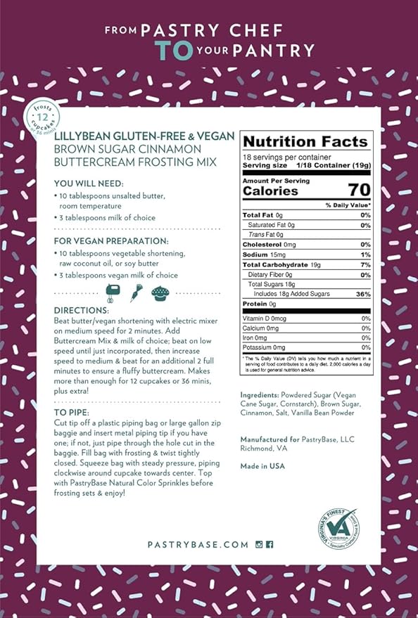 - PERFECT RICH INDULGENCE: With LillyBean's Gluten Free Brown Sugar Cinnamon Buttercream Frosting Mix, you can effortlessly whip up creamy, fluffy frosting in just minutes. This versatile mix delivers the perfect balance of fresh brown sugar cinnamon flavor and smooth texture, making it ideal for frosting cakes, cupcakes, and other desserts.