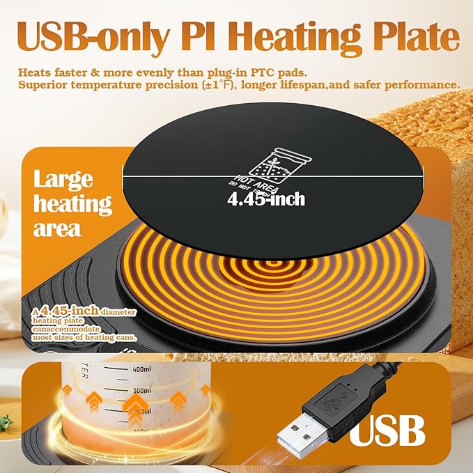 - 【Extra Safe,More sensitive】Our sourdough heating mat upgraded USB power supply ensures ultimate safety and broader compatibility. Compared to the ordinary plug-in PTC heating plates, the USB-dedicated heating system offers significantly faster heat conduction and a much smaller difference between the actual and displayed temperature (±1℉).