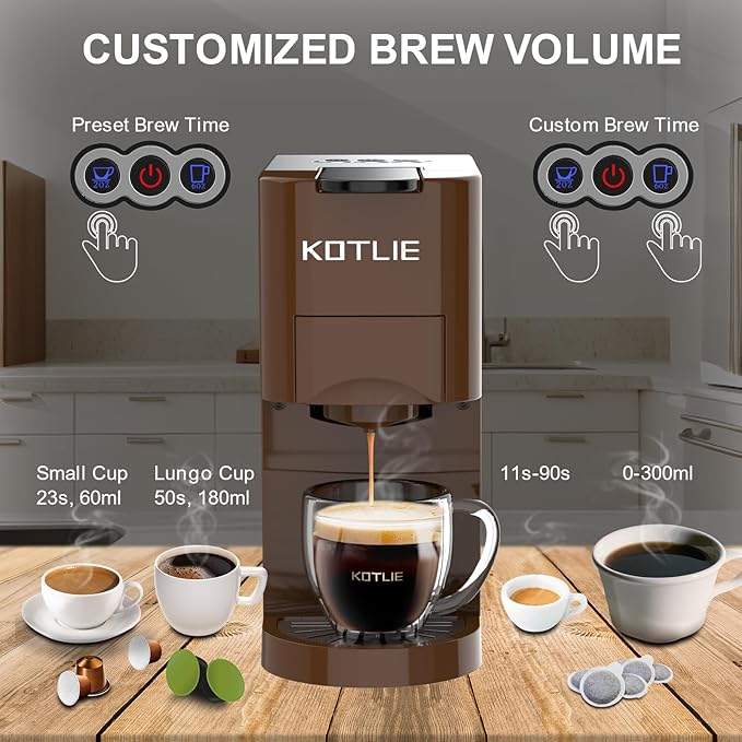 - 【Volume Selection]】KOTLIE Single serve Coffee Maker is set up with single and double cup brewing buttons through the flow control system with electronic timing. If you like espresso, you can choose a single cup of 40-60ML; if you like Lungo and Americano, you can choose a double cup of 180-220ML. If you want more capacity, you can LONG PRESS the large cup button for 90 seconds, then release the button, the maximum 300ML capacity is set successfully.