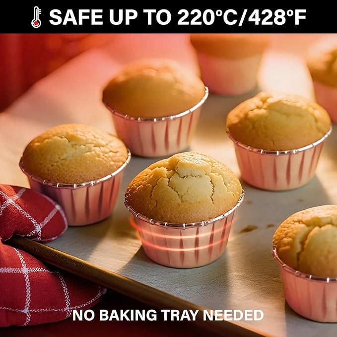 - 【No Baking tray needed】-These muffin cups are made of premium quality aluminum foil that make these strong and sturdy. Put them into the oven and bake them directly. No Baking tray needed. Please also note that these muffin cups do not need to be added with any molds, otherwise it will be like adding a fire source and it will easily stick to the bottom of the pan.