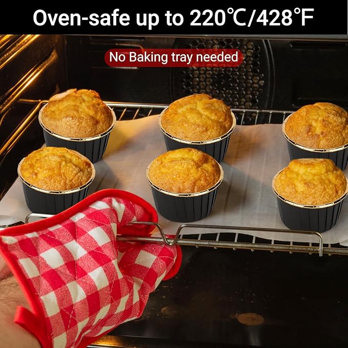 - 【No Baking tray needed】-These muffin cups are made of premium quality aluminum foil that make these strong and sturdy. Put them into the oven and bake them directly. No Baking tray needed. Please also note that these muffin cups do not need to be added with any molds, otherwise it will be like adding a fire source and it will easily stick to the bottom of the pan.